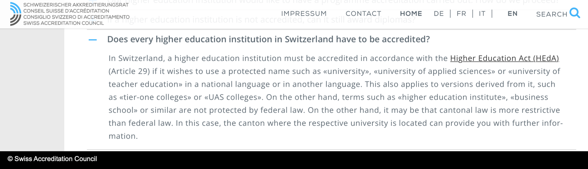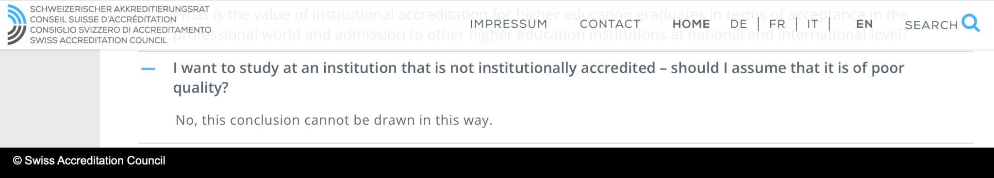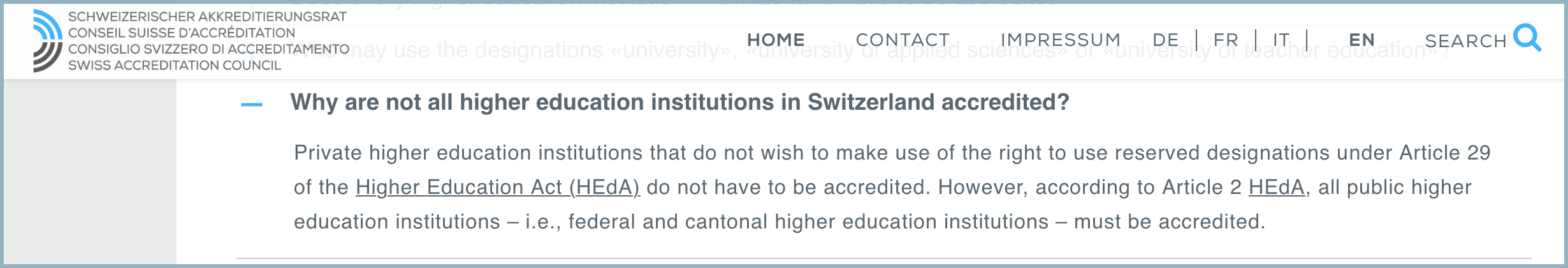 Nguồn: Swiss Accreditation Council; trích từ phần FAQ, từ câu hỏi, “Does every higher education institution in Switzerland have to be accredited?” Đọc thêm tại đây.