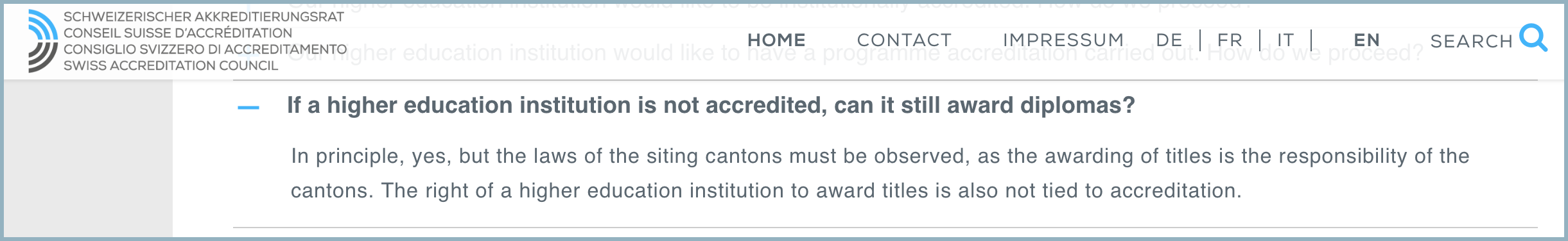 Nguồn: Swiss Accreditation Council; trích từ phần FAQ, từ câu hỏi, “If a higher education institution is not accredited, can it still award diplomas?” Đọc thêm tại đây.