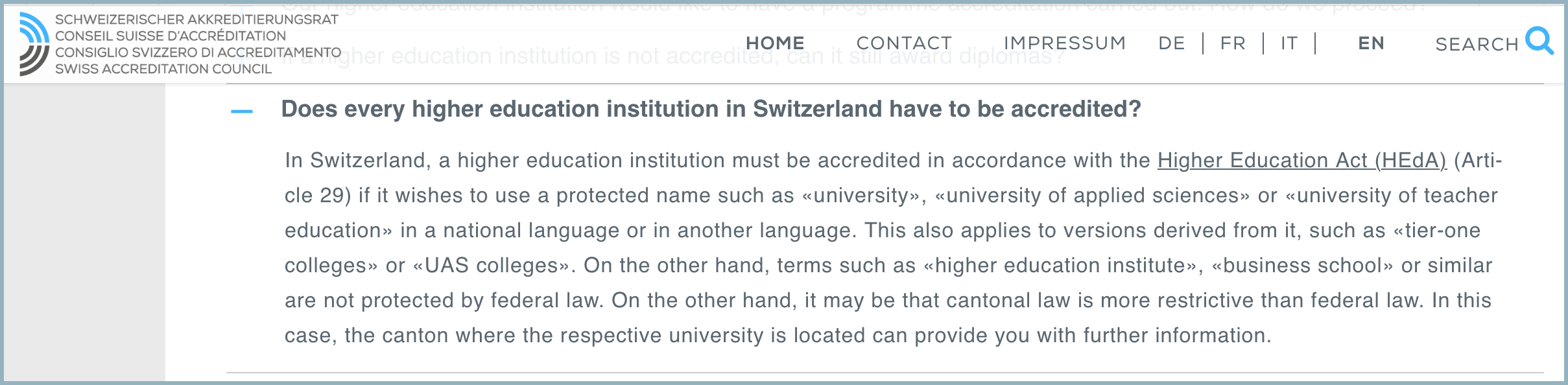 Hướng dẫn từ Swiss Accreditation Council, cơ quan quản lý chất lượng giáo dục mà luật giáo dục đại học Thuỵ Sĩ đề cập: