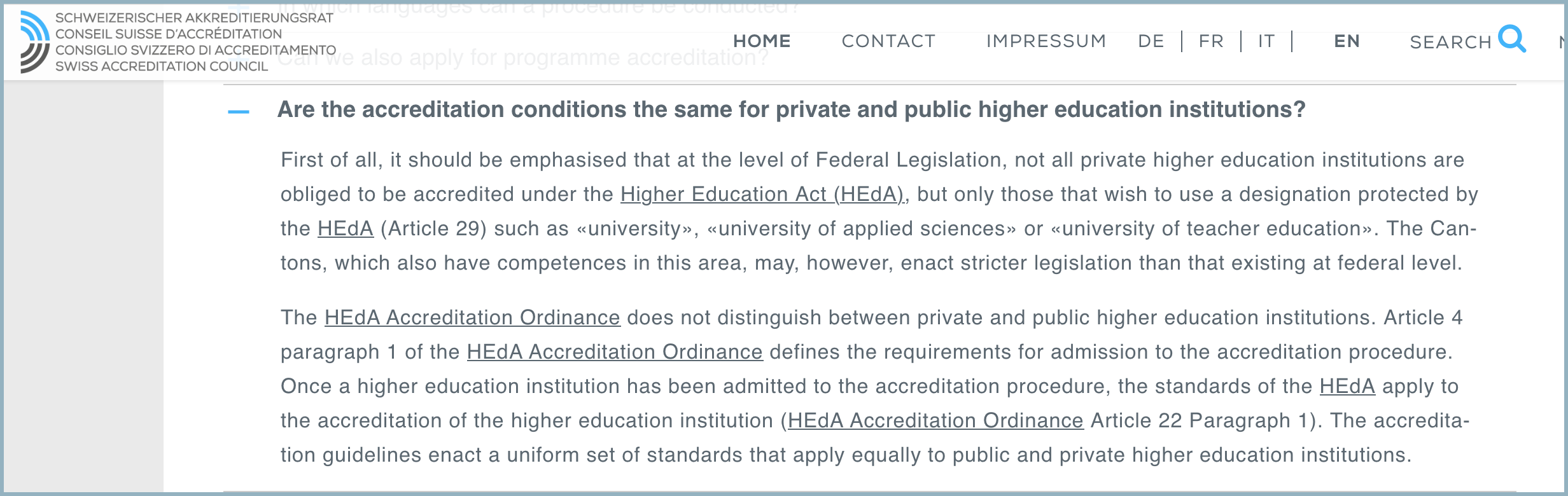 Nguồn: Swiss Accreditation Council; trích từ phần FAQ, từ câu hỏi, “Are the accreditation conditions the same for private and public higher education institutions?” Đọc thêm tại đây.