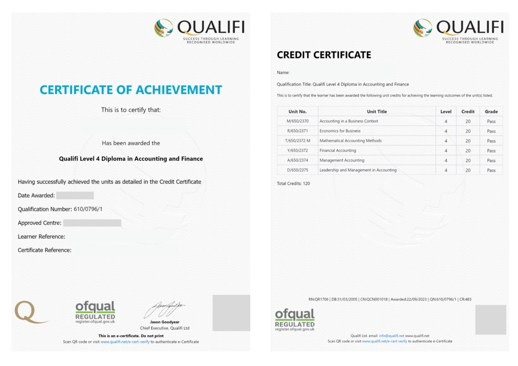 - Qualifi Level 4 Diploma in Accounting & Finance - mã Ofqual UK.Gov: 610/0796/1