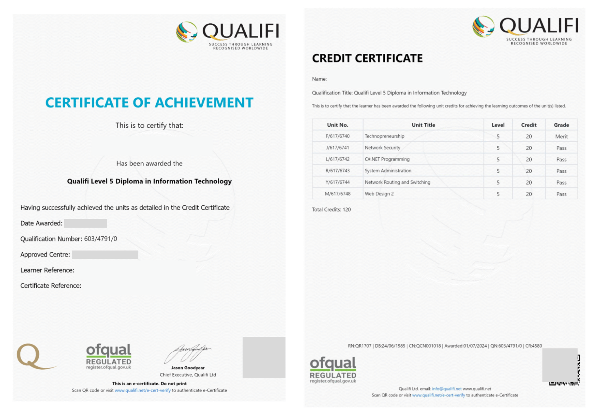 • Qualifi Level 5 Diploma in Information Technology được kiểm định với mã Ofqual UK.Gov  603/4791/0Tham khảo thông tin kiểm định tại TẠI ĐÂY.