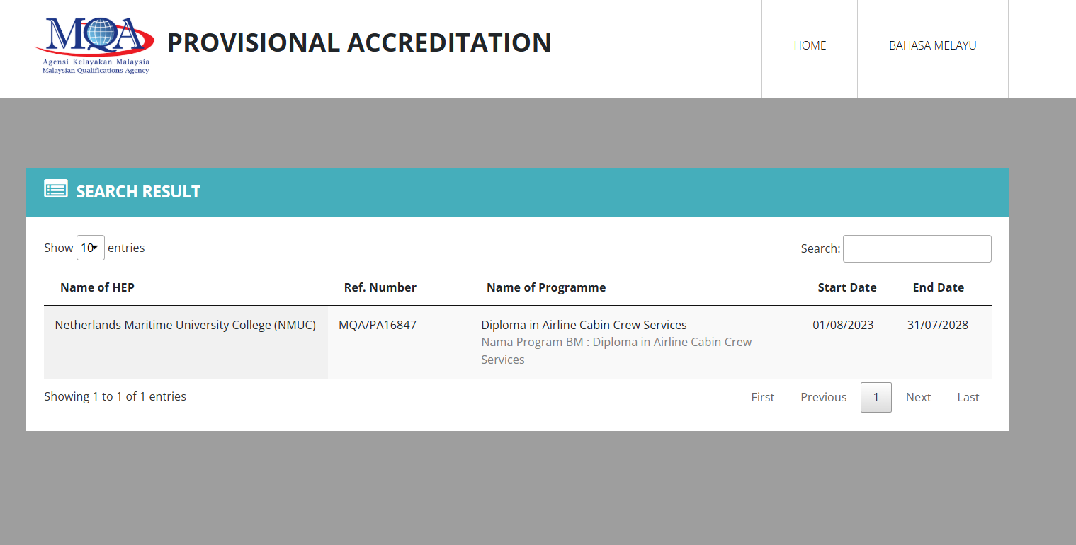 Kiểm định của chương trình Diploma in Airlines Cabin Crew Services của NMUC với MQA (PA), cơ quan quản lý giáo dục quốc gia Malaysia: TẠI ĐÂY