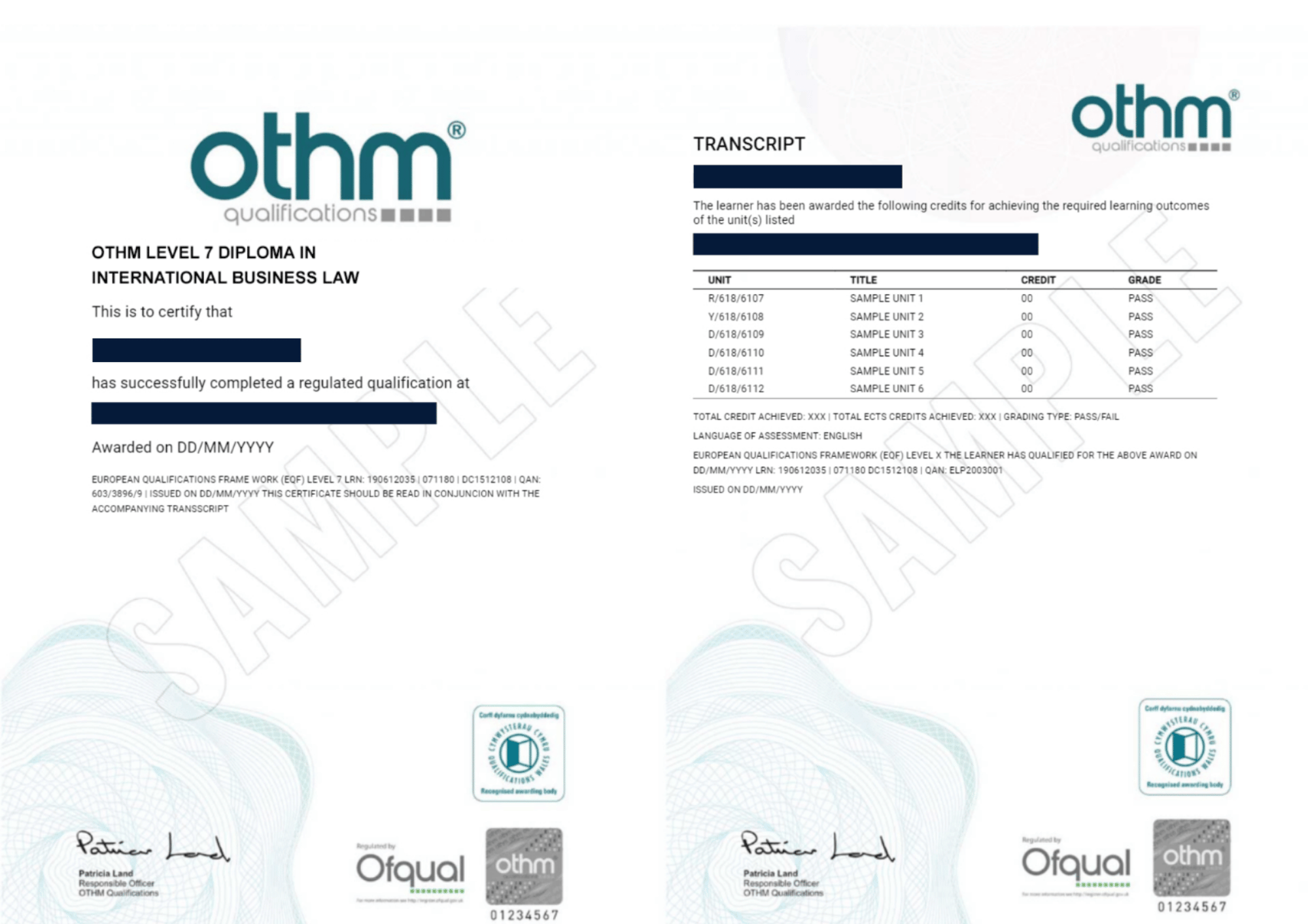 - OTHM Level 7 Diploma in International Business Law được kiểm định với mã Ofqual UK.Gov 603/7722/7. Tham khảo thông tin công nhận TẠI ĐÂY.