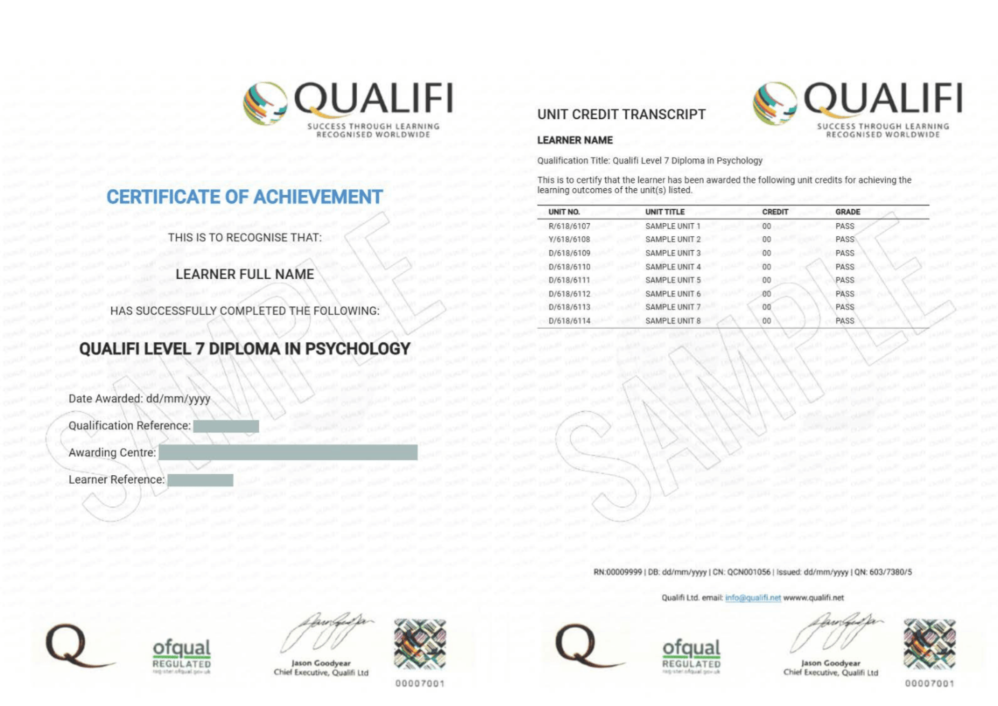 - Qualifi Level 7 Diploma in Psychology được kiểm định với mã Ofqual UK.Gov 610/2064/3. Tham khảo thông tin công nhận TẠI ĐÂY.