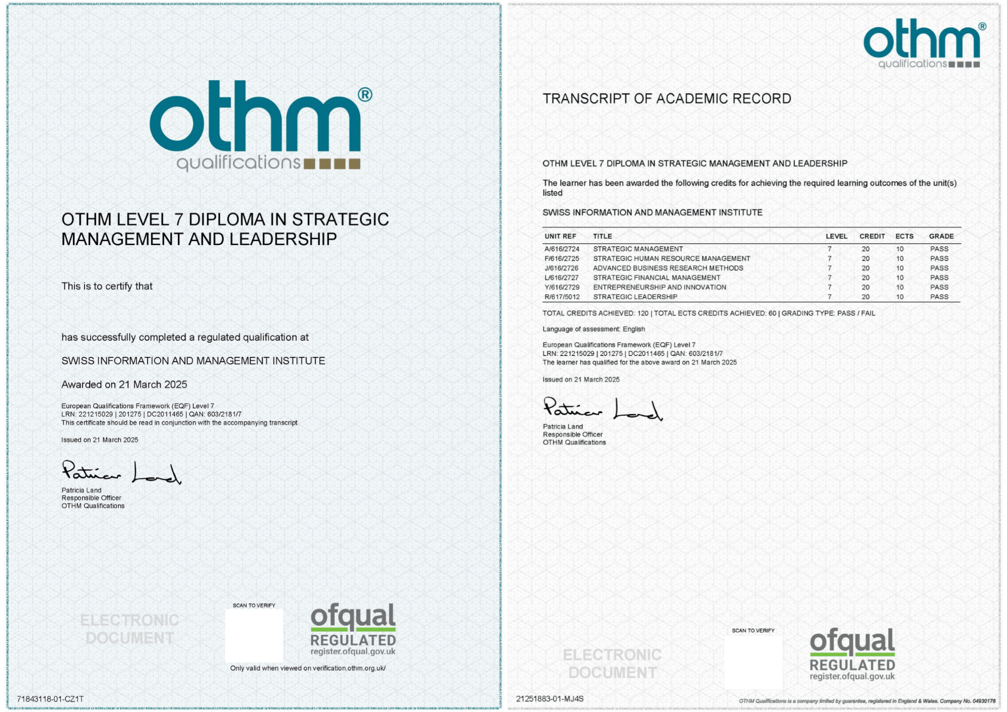 • Level 7 Diploma in Strategic Leadership and Management từ Hệ thống Khảo thí & Cấp văn bằng năng lực quốc gia Anh Quốc OTHM (603/2181/7)
