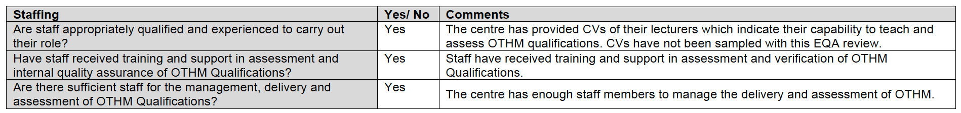Kết quả đánh giá về tiêu chí “Nhân sự”, những người sẽ liên quan trực tiếp đến bài giảng, triển khai và chấm điểm. 100% CV, hợp đồng phải được nộp để thẩm tra. Lấy ví dụ một chương trình tích hợp văn bằng năng lực quốc gia OTHM.