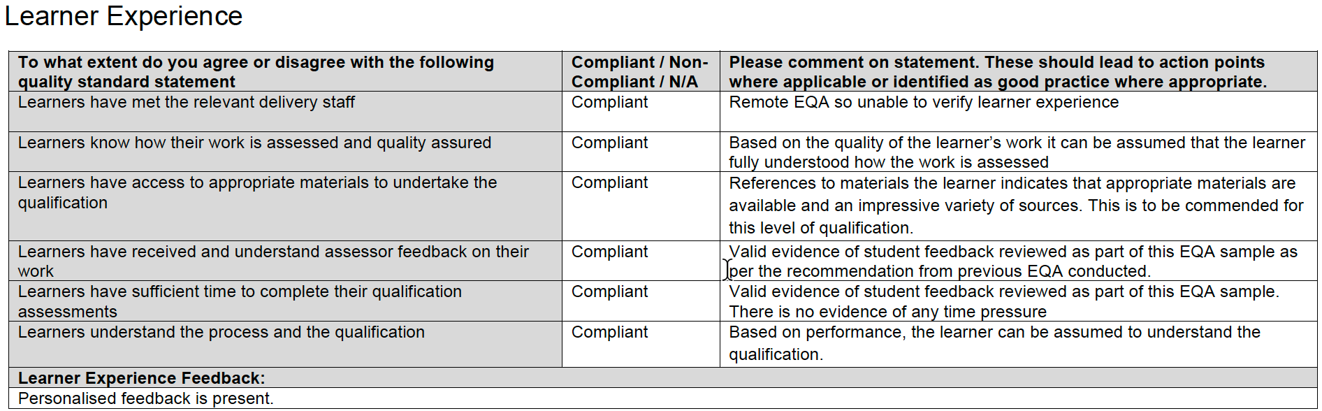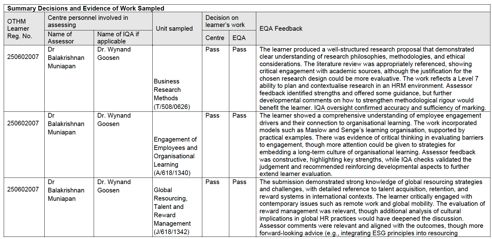 Trong mẫu kiểm định bạn cung cấp (cùng một mã học viên – learner number), cả ba học phần đều được xác nhận phải bảo đảm đạt (Pass/Pass: Centre/EQA), kèm nhận xét chi tiết: