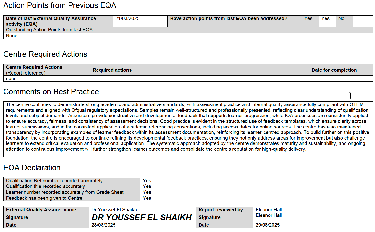 - Hồ sơ được ký xác nhận và ghi ngày bởi Giám khảo độc lập (External Quality Assurer) và Người thẩm định (Reviewer), được thể hiện rõ trong báo cáo EQA.