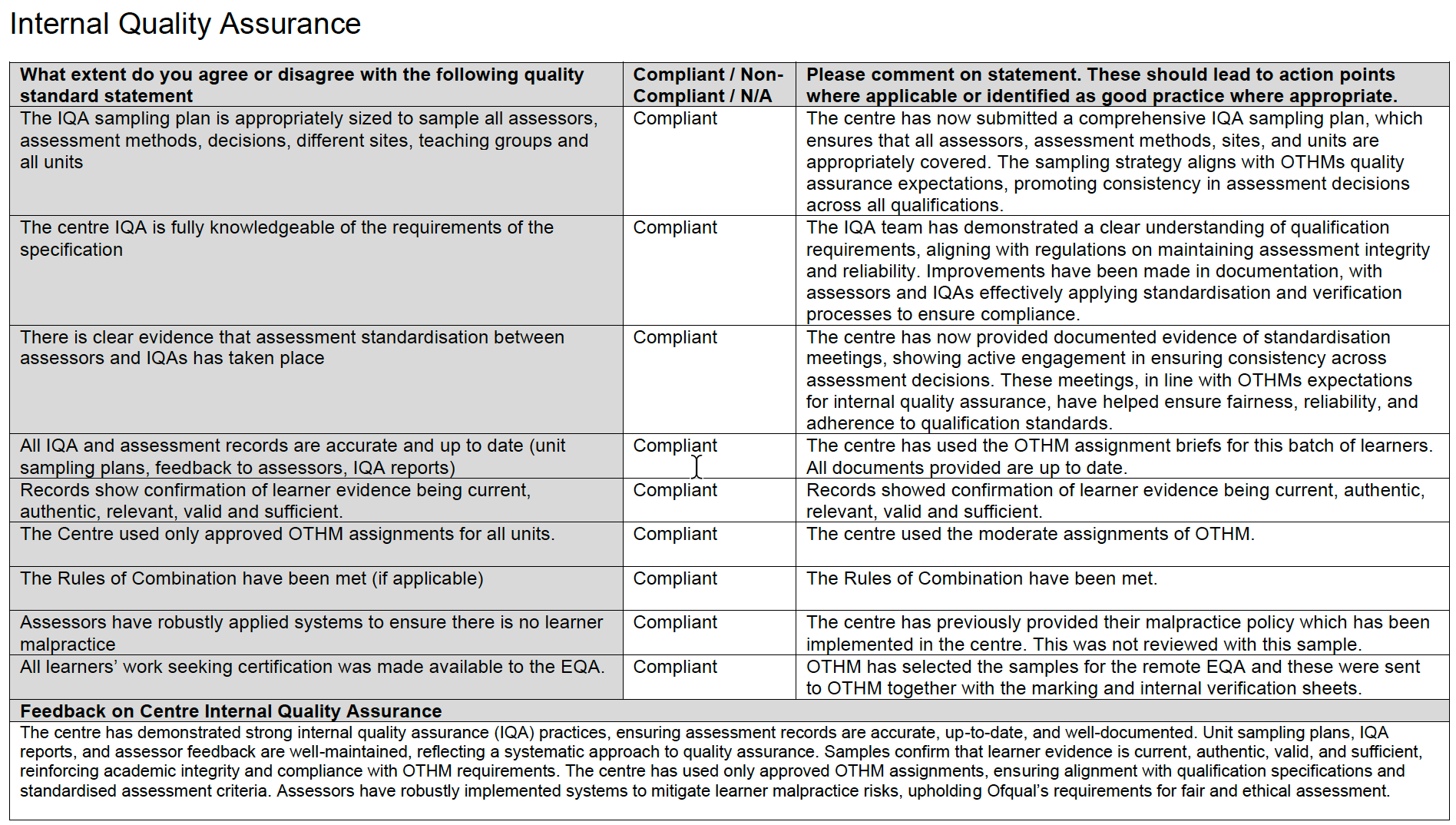 Kết quả đánh giá nội bộ. Đây là kết luận quan trọng và phải đảm bảo đạt 100% trước khi vào các bước tiếp theo. Lấy ví dụ một chương trình tích hợp văn bằng năng lực quốc gia OTHM.