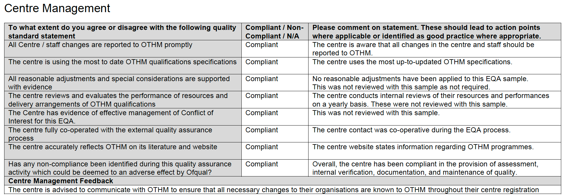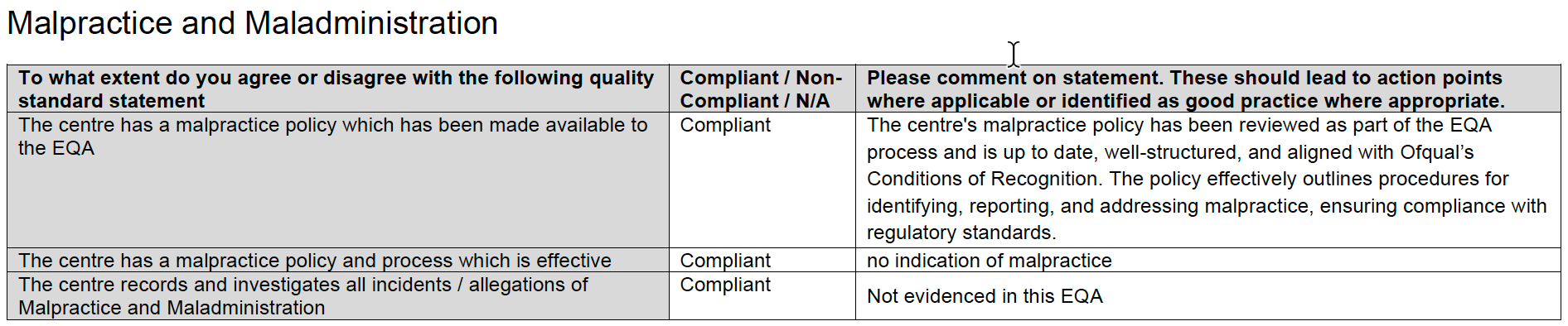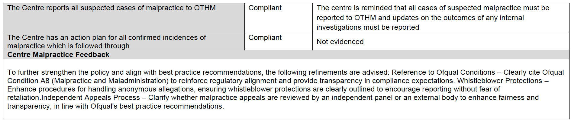 - Không để xảy ra sai phạm nghiêm trọng (non-compliance) có thể gây ảnh hưởng bất lợi theo quy định của Ofqual (chính phủ), và điều này phải bảo đảm đạt.