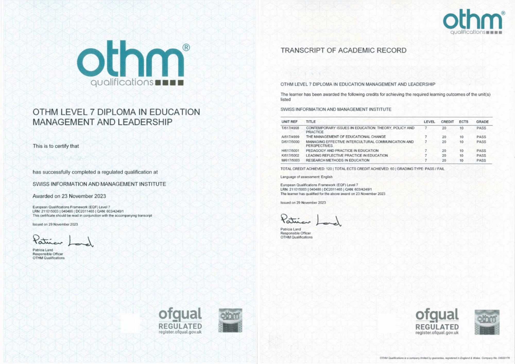 Mẫu của văn bằng năng lực quốc gia Anh Quốc chuyên ngành Quản lý và Lãnh đạo giáo dục (công nhận bởi Chính phủ Anh Quốc cấp độ Thạc sĩ). Đây là văn bằng quốc gia Anh Quốc, được đánh giá rất cao trong môi trường làm việc quốc tế. Văn bằng này tích hợp trong chương trình của SIMI Swiss do SIMI Swiss được công nhận bởi hệ thống này.