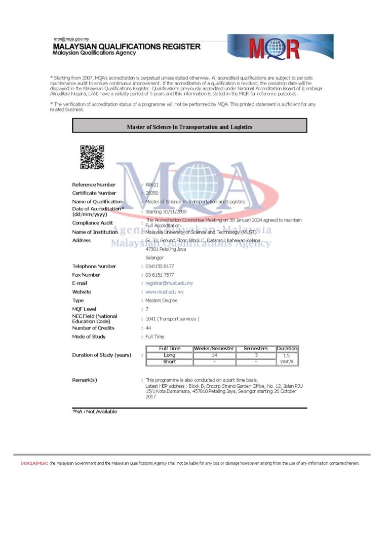 Chương trình Thạc sĩ Logistics và Vận tải đa phương thức được công nhận Bởi Bộ giáo dục Malaysia và đạt kiểm định quốc gia MQA
